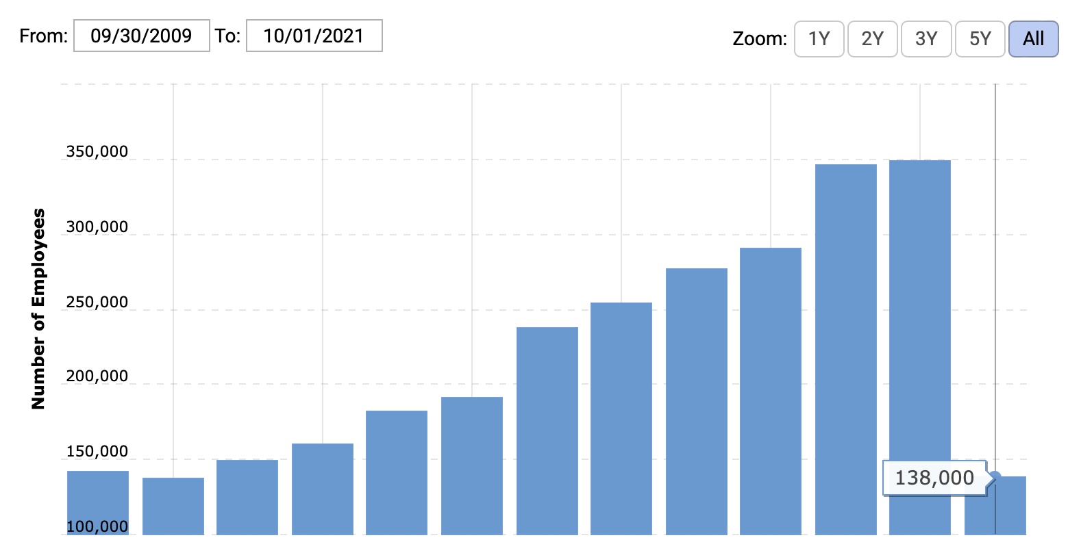 And it makes sense because the number of Starbucks employees has reduced dramatically since Starbucks had 349,000 employees in 2020, which includes the period pre-pandemic, and 138,000 in 2021, but coffee is still flowing.